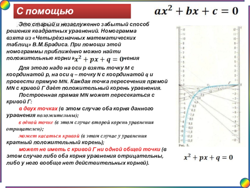 Для этого надо на оси р взять точку M с координатой р, на оси q – точку N с координатой q и провести прямую MN. Каждая точка пересечения прямой MN с кривой Г даѐт положительный корень уравнения.