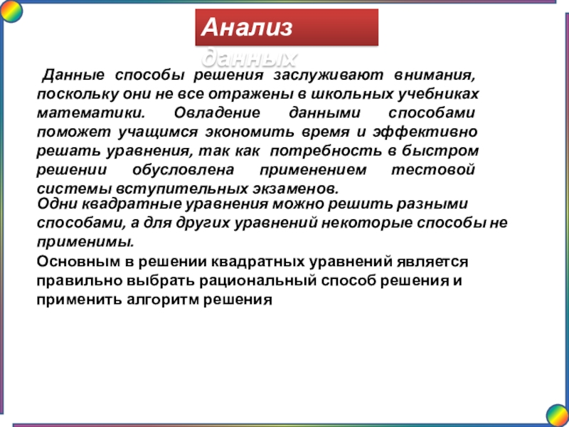 Данные способы решения заслуживают внимания, поскольку они не все отражены в школьных учебниках математики. Овладение данными способами поможет учащимся экономить время и эффективно решать уравнения, так как потребность в быстром решении обусловлена применением тестовой системы вступительных экзаменов.