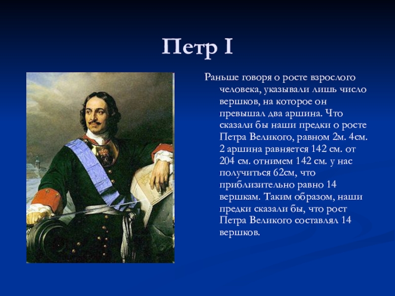 Петр IРаньше говоря о росте взрослого человека, указывали лишь число вершков, на которое он превышал два аршина.