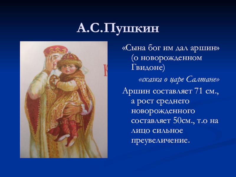 А.С.Пушкин«Сына бог им дал аршин» (о новорожденном Гвидоне)    «сказка о царе Салтане»Аршин составляет 71