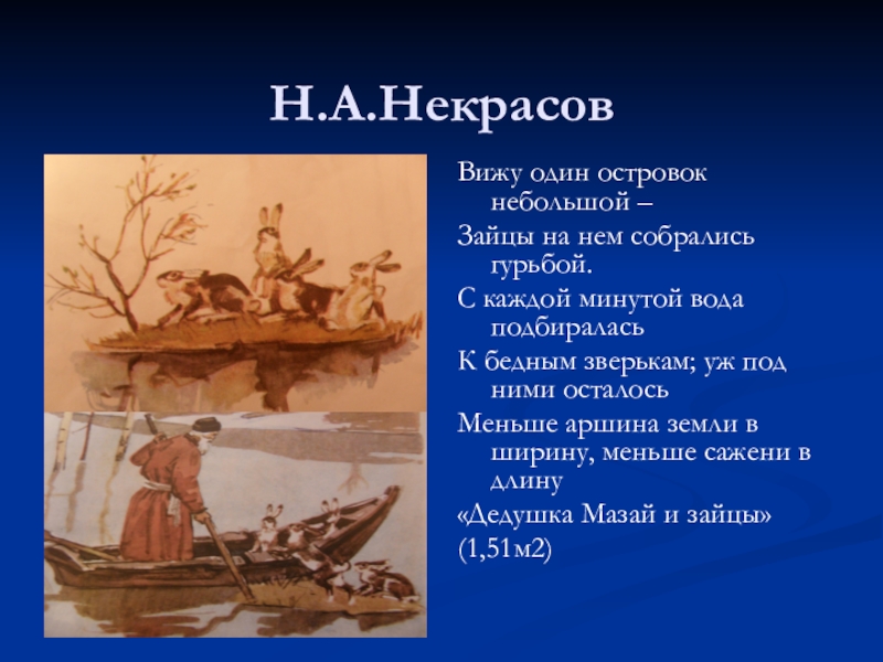 Н.А.НекрасовВижу один островок небольшой – Зайцы на нем собрались гурьбой.С каждой минутой вода подбираласьК бедным зверькам; уж