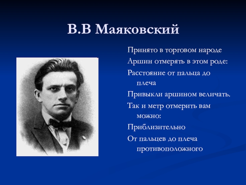 В.В МаяковскийПринято в торговом народеАршин отмерять в этом роде:Расстояние от пальца до плечаПривыкли аршином величать.Так и метр