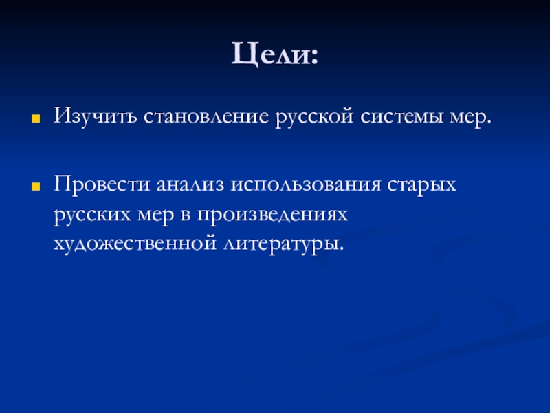 Цели:Изучить становление русской системы мер.Провести анализ использования старых русских мер в произведениях художественной литературы.