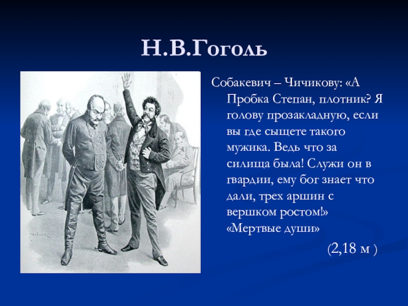 Н.В.ГогольСобакевич – Чичикову: «А Пробка Степан, плотник? Я голову прозакладную, если вы где сыщете такого мужика. Ведь
