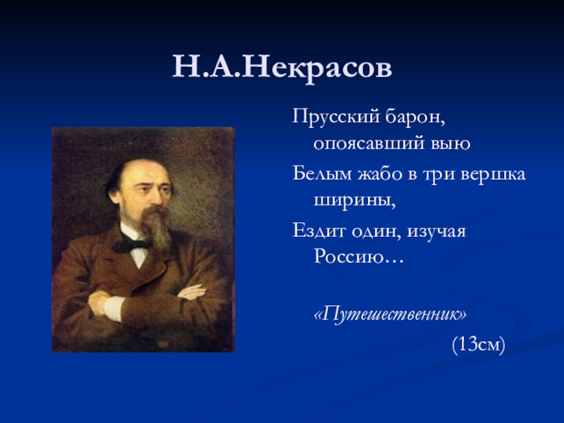 Н.А.НекрасовПрусский барон, опоясавший выюБелым жабо в три вершка ширины,Ездит один, изучая Россию…