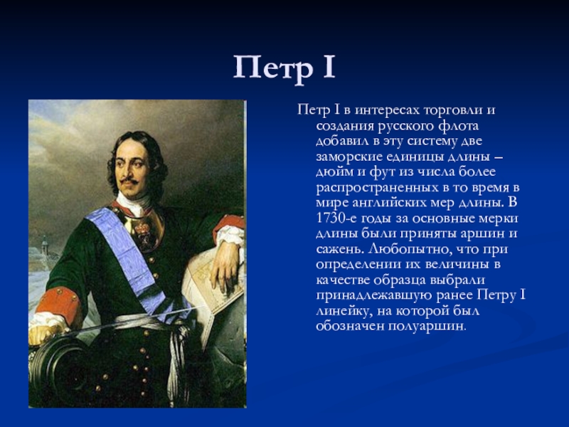 добавил в эту систему две заморские единицы длины – дюйм и фут из числа более распространенных в то время в мире английских мер длины. В 1730-е годы за основные мерки длины были приняты аршин и сажень. Любопытно, что при определении их величины в качестве образца выбрали принадлежавшую ранее Петру I линейку, на которой был обозначен полуаршин.