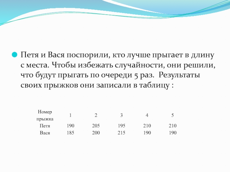 Слайд 6Петя и Вася поспорили, кто лучше прыгает в длину с места.