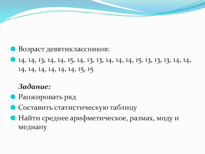 Найти среднее арифметическое, размах, моду и медиану