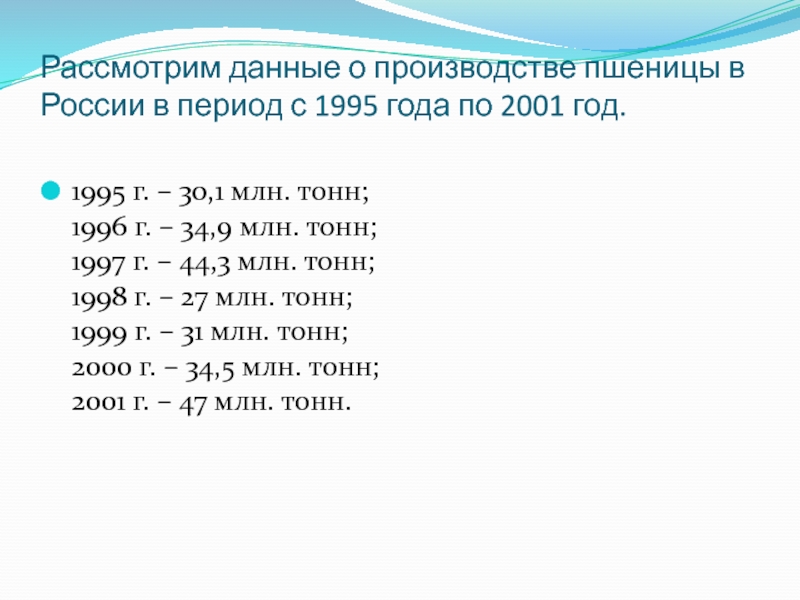 Слайд 4Рассмотрим данные о производстве пшеницы в России в период с 1995