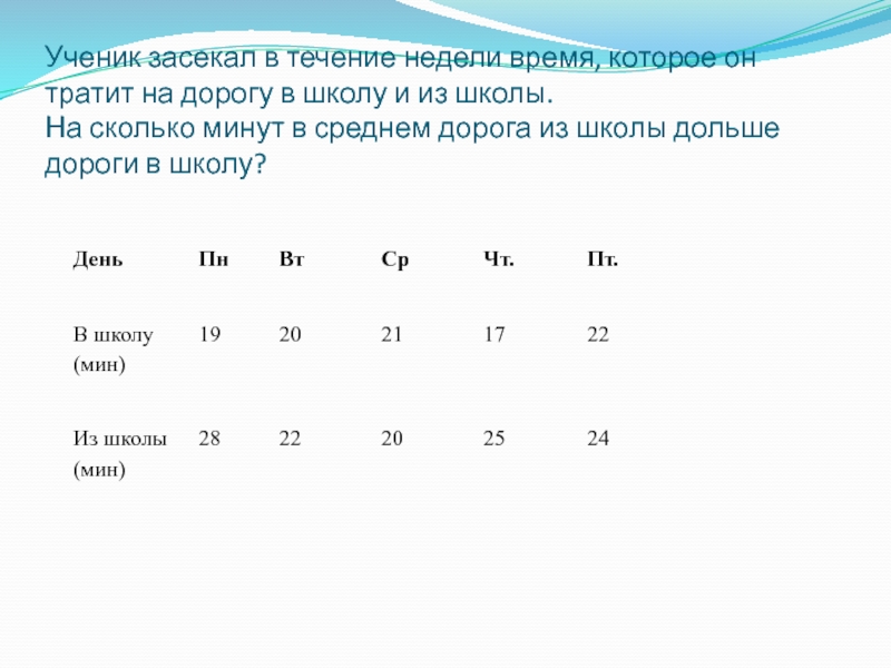 Слайд 10Ученик засекал в течение недели время, которое он тратит на дорогу