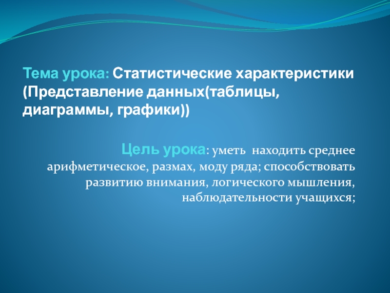 Слайд 3Тема урока: Статистические характеристики(Представление данных(таблицы, диаграммы, графики))