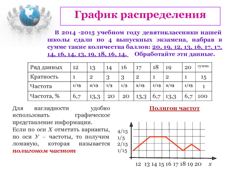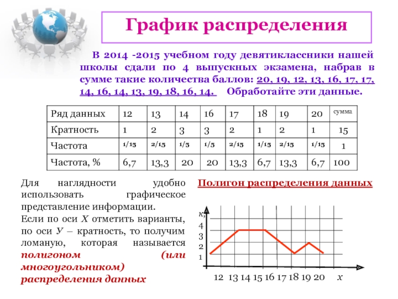 Если по оси Х отметить варианты, по оси У – кратность, то получим ломаную, которая называется полигоном (или многоугольником) распределения данных