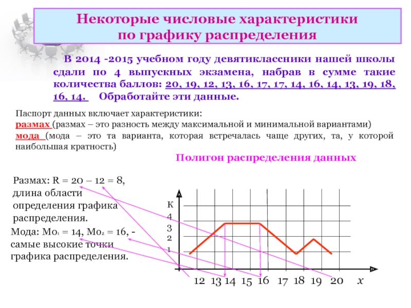 Размах: R = 20 – 12 = 8, длина области определения графика распределения.