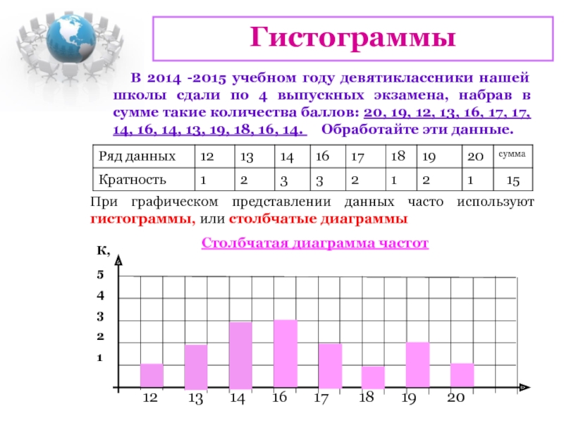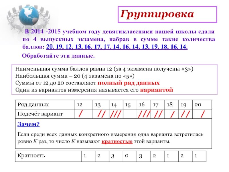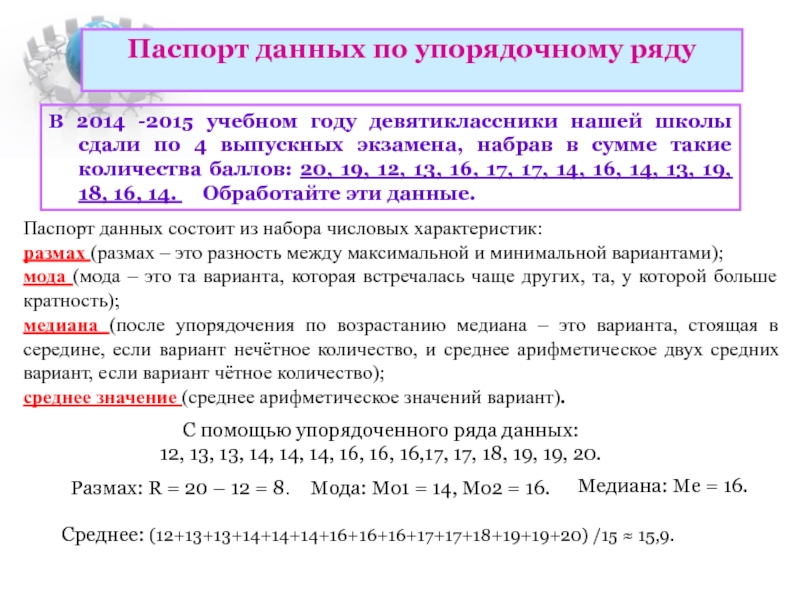 В 2014 -2015 учебном году девятиклассники нашей школы сдали по 4 выпускных экзамена, набрав в сумме такие количества баллов: 20, 19, 12, 13, 16, 17, 17, 14, 16, 14, 13, 19, 18, 16, 14. Обработайте эти данные.