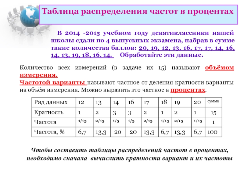 Частотой варианты называют частное от деления кратности варианты на объём измерения. Можно выразить это частное в процентах.
