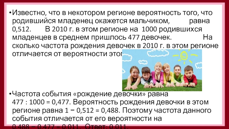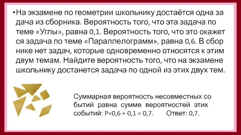 Суммарная вероятность несовместных событий равна сумме вероятностей этих событий: P=0,6 + 0,1 = 0,7. Ответ: 0,7.