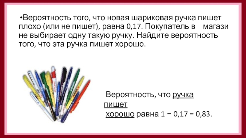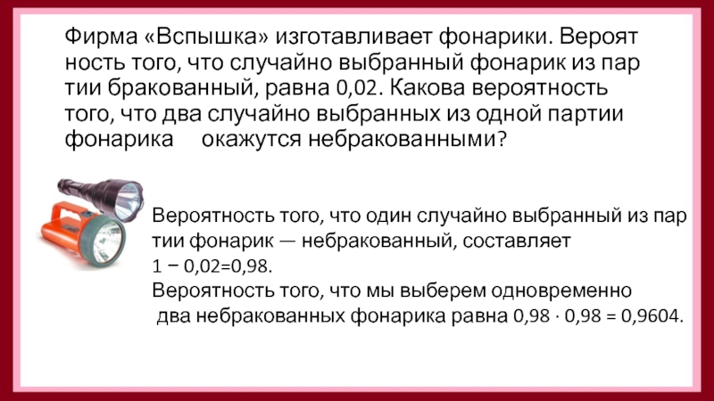 Вероятность того, что один случайно выбранный из партии фонарик — небракованный, составляет 1 − 0,02=0,98. Вероятность того, что мы выберем одновременно