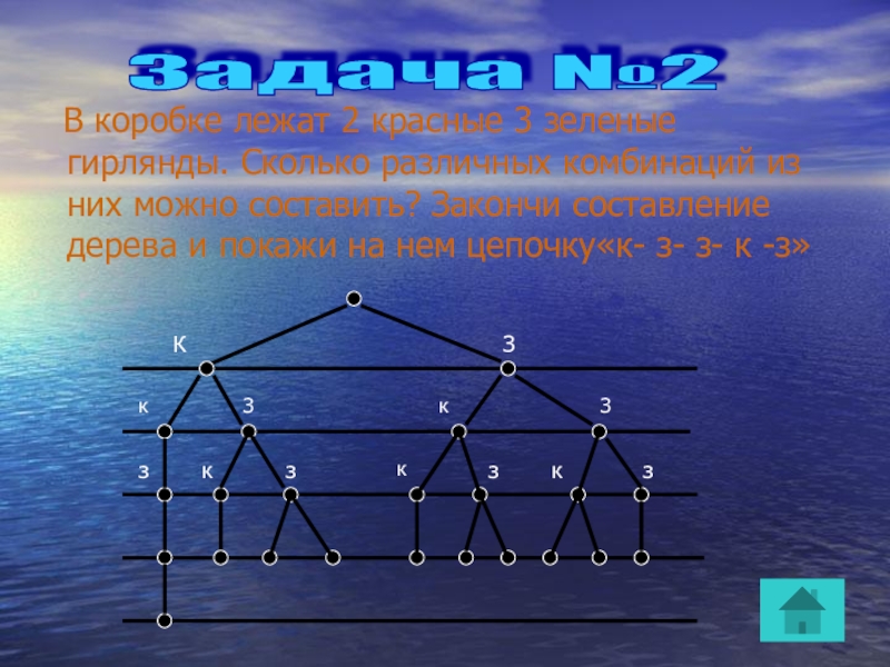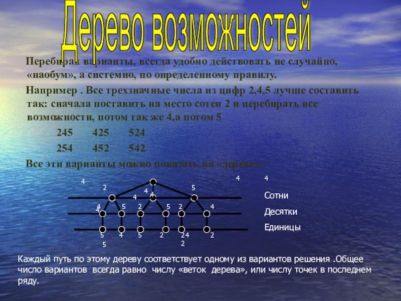 Каждый путь по этому дереву соответствует одному из вариантов решения .Общее число вариантов всегда равно числу «веток дерева», или числу точек в последнем ряду.