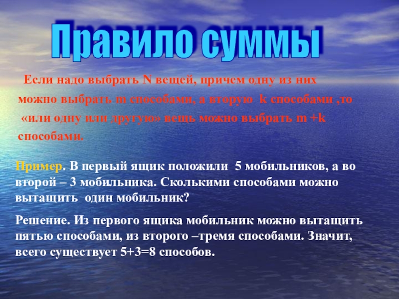 Пример. В первый ящик положили 5 мобильников, а во второй – 3 мобильника. Сколькими способами можно вытащить один мобильник?