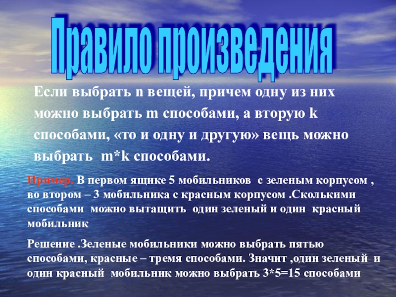 Пример. В первом ящике 5 мобильников с зеленым корпусом , во втором – 3 мобильника с красным корпусом .Сколькими способами можно вытащить один зеленый и один красный мобильник