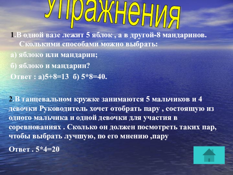 2.В танцевальном кружке занимаются 5 мальчиков и 4 девочки Руководитель хочет отобрать пару , состоящую из одного мальчика и одной девочки для участия в соревнованиях . Сколько он должен посмотреть таких пар, чтобы выбрать лучшую, по его мнению ,пару