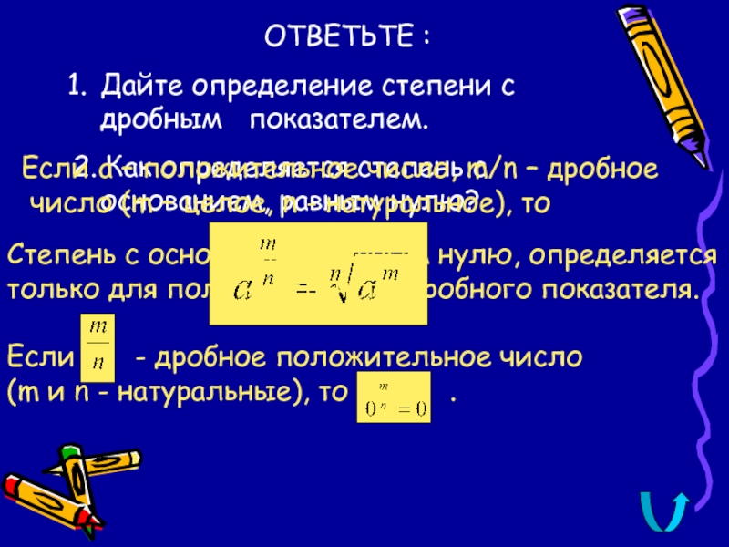 ОТВЕТЬТЕ :Дайте определение степени с дробным  показателем.2. Как определяется степень с основанием, равным нулю?