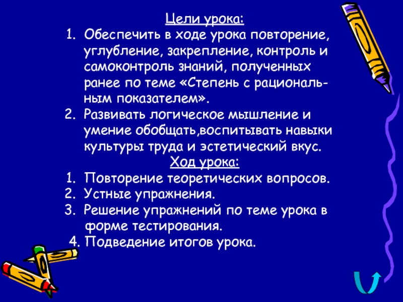 Цели урока:Обеспечить в ходе урока повторение, углубление, закрепление, контроль и самоконтроль знаний, полученных ранее по теме «Степень с рациональ- ным показателем».Развивать логическое мышление и умение обобщать,воспитывать навыки культуры труда и эстетический вкус.Ход урока:Повторение