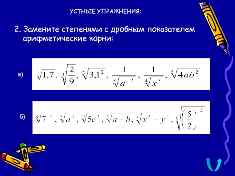 УСТНЫЕ УПРАЖНЕНИЯ:2. Замените степенями с дробным показателем арифметические корни:   а)    б)