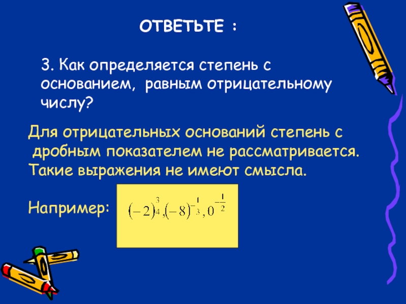 ОТВЕТЬТЕ :3. Как определяется степень с основанием, равным отрицательному числу?