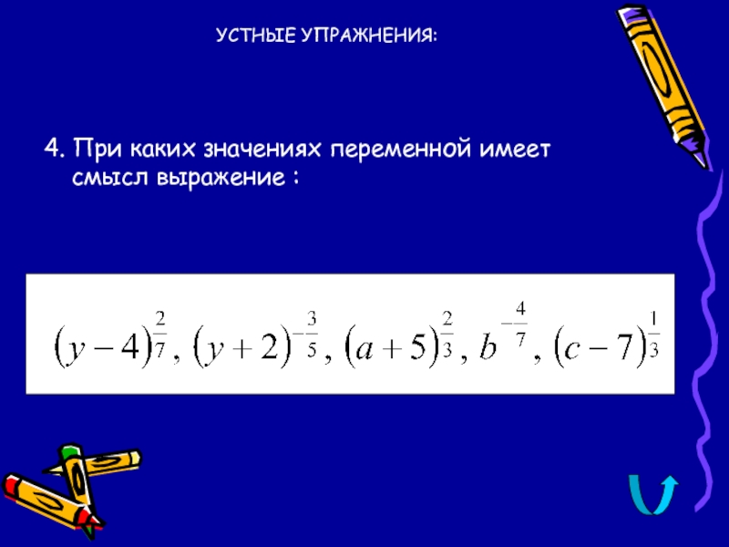 УСТНЫЕ УПРАЖНЕНИЯ:4. При каких значениях переменной имеет смысл выражение :