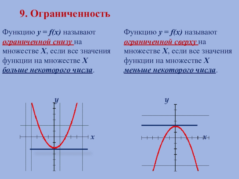Функцию у = f(х) называют ограниченной сверху на множестве Х, если все значения функции на множестве Х меньше некоторого числа.