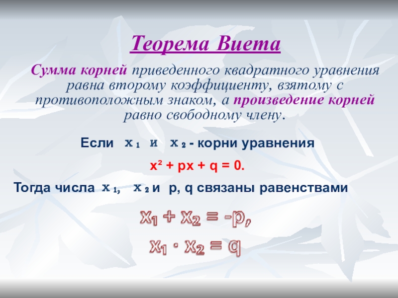 Сумма корней приведенного квадратного уравнения равна второму коэффициенту, взятому с противоположным знаком, а произведение корней равно свободному члену.