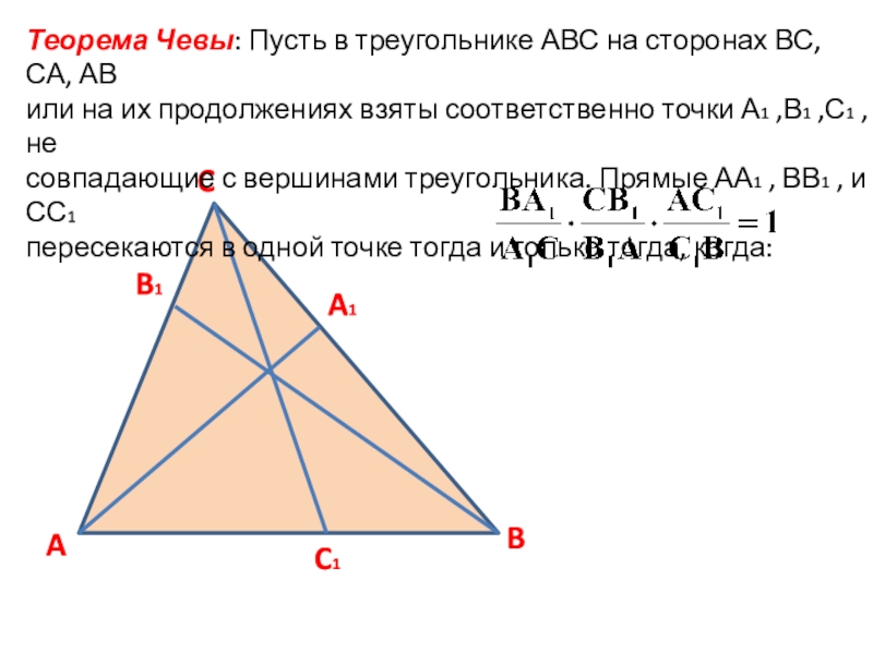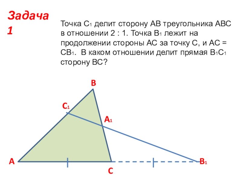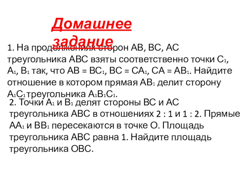 2. Точки А1 и В1 делят стороны ВС и АС треугольника АВС в отношениях 2 : 1 и 1 : 2. Прямые АА1 и ВВ1 пересекаются в точке О. Площадь треугольника АВС равна 1. Найдите площадь треугольника ОВС.