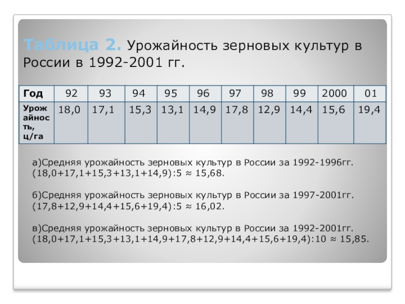 Слайд 4Таблица 2. Урожайность зерновых культур в России в 1992-2001 гг.