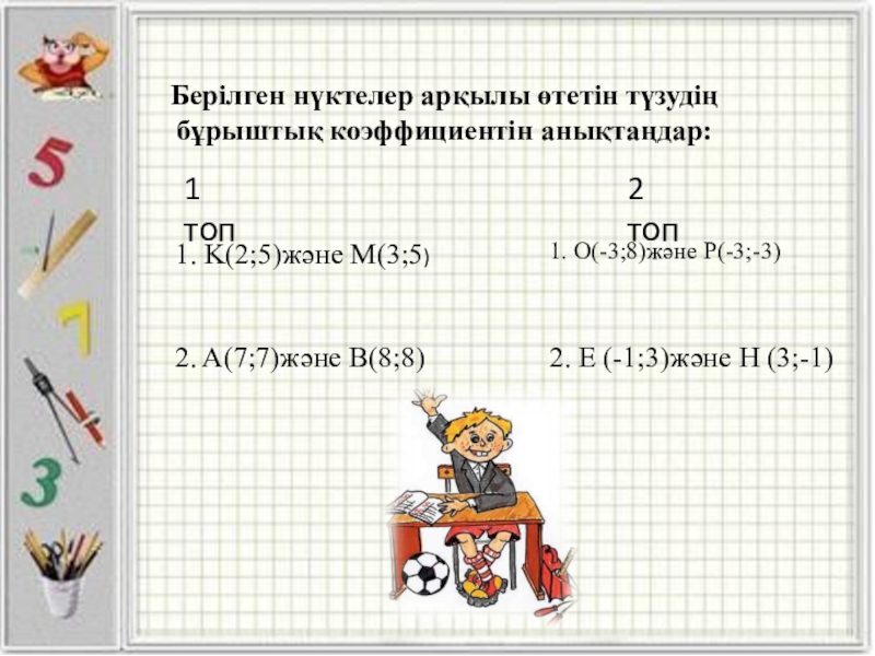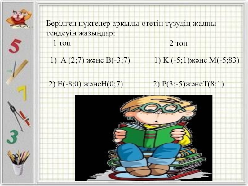 3.A(9;-3) және B(-6;1) нүктелерінен өтетін түзудің теңдеуін жазыңдар.