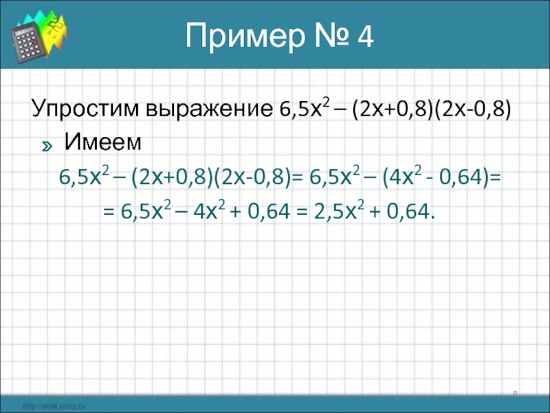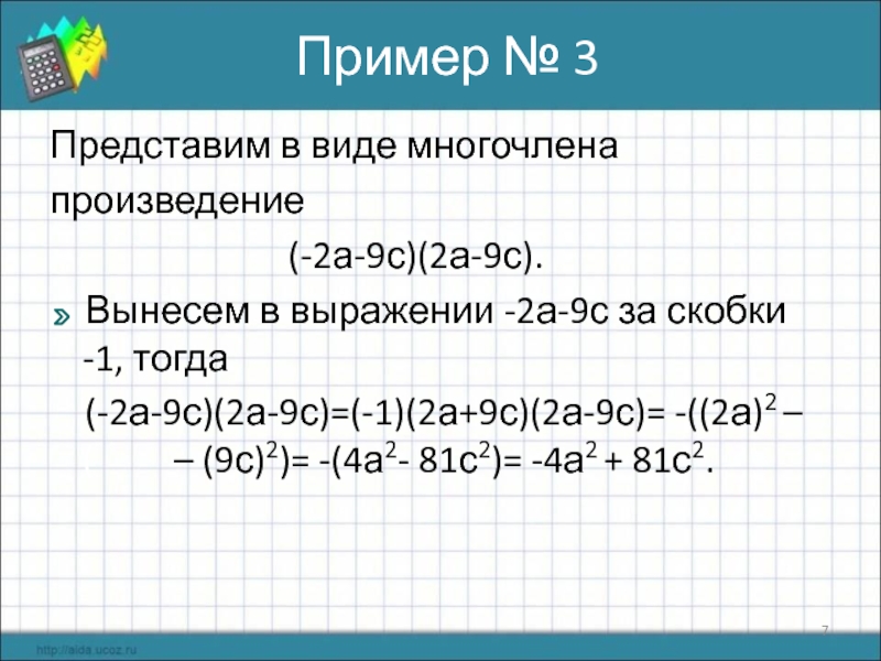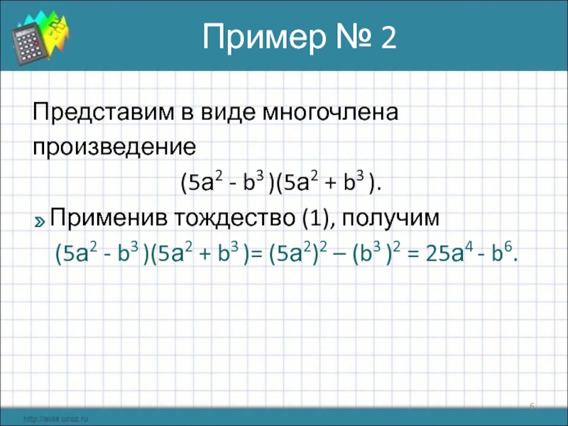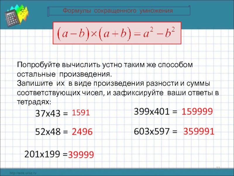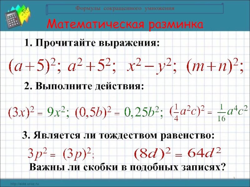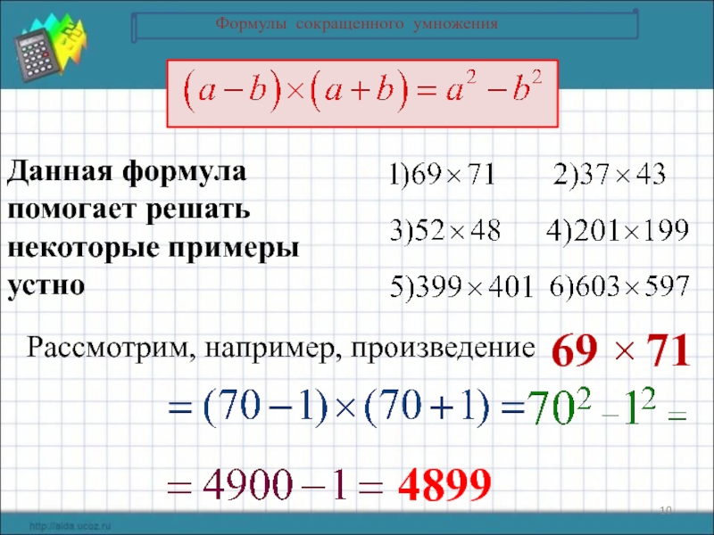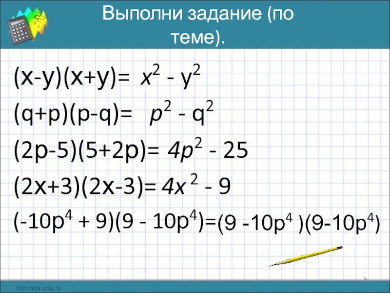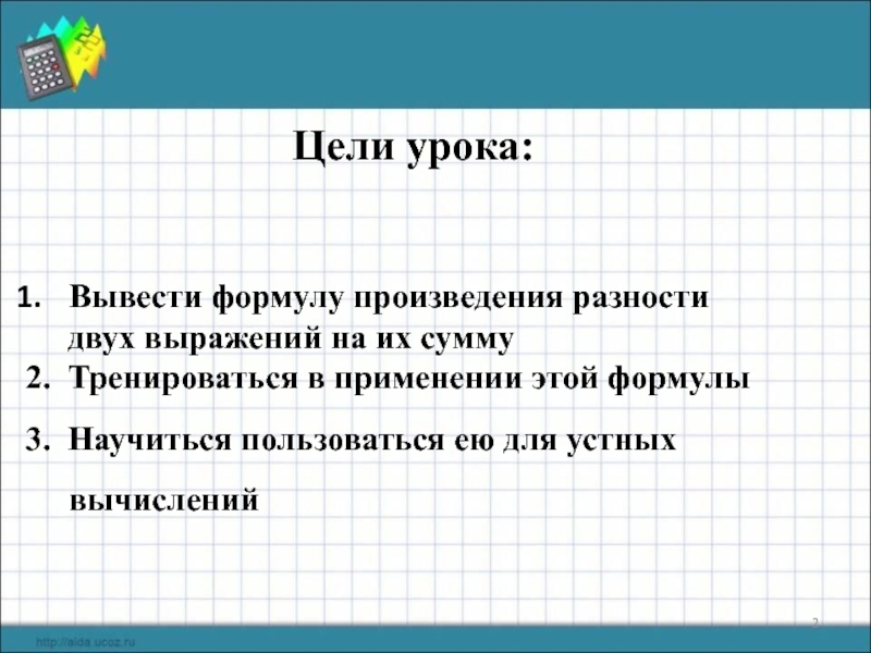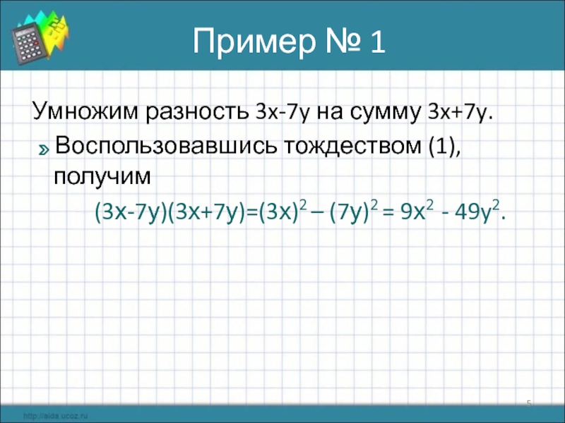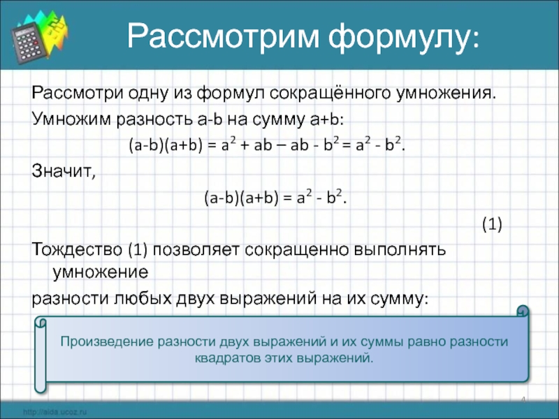 Произведение разности двух выражений и их суммы равно разности квадратов этих выражений.