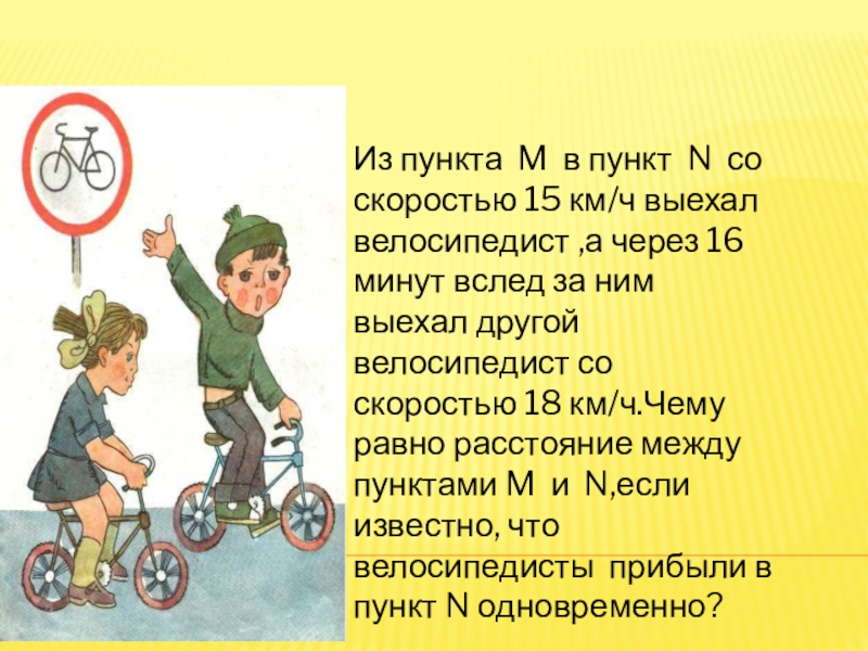 км/ч выехал велосипедист ,а через 16 минут вслед за ним выехал другой велосипедист со скоростью 18 км/ч.Чему равно расстояние между пунктами M и N,если известно, что велосипедисты прибыли в пункт N одновременно?