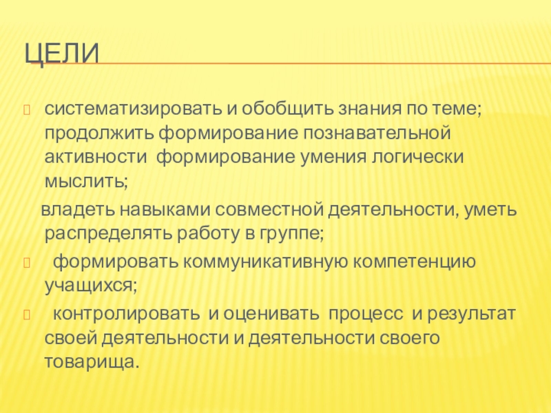 Целисистематизировать и обобщить знания по теме; продолжить формирование познавательной активности формирование умения логически мыслить; владеть навыками совместной деятельности, уметь распределять работу в группе; формировать коммуникативную компетенцию учащихся; контролировать и оценивать процесс и результат своей деятельности