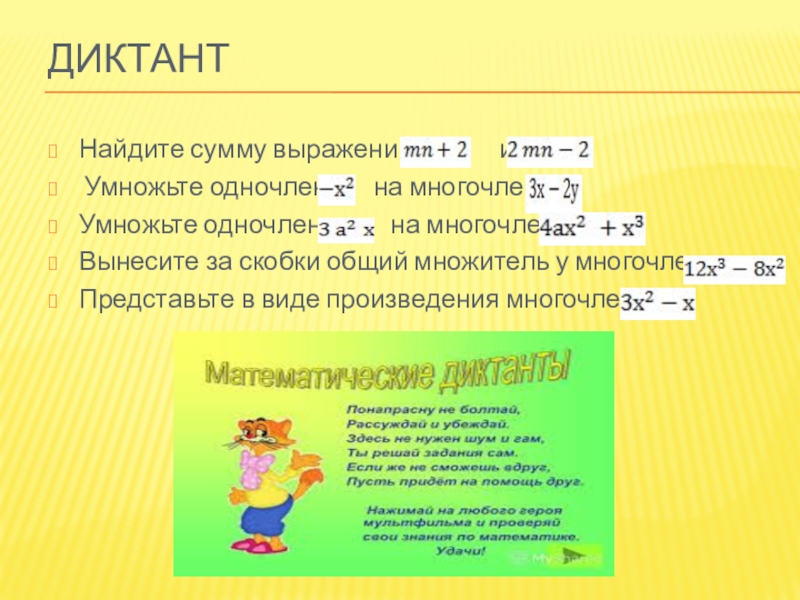 Презентация, доклад по математике на тему Умножение одночлена на многочлен