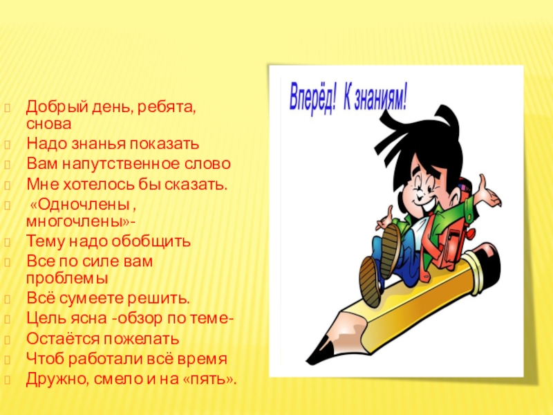 Добрый день, ребята, сноваНадо знанья показатьВам напутственное словоМне хотелось бы сказать. «Одночлены ,многочлены»-Тему надо обобщитьВсе по силе