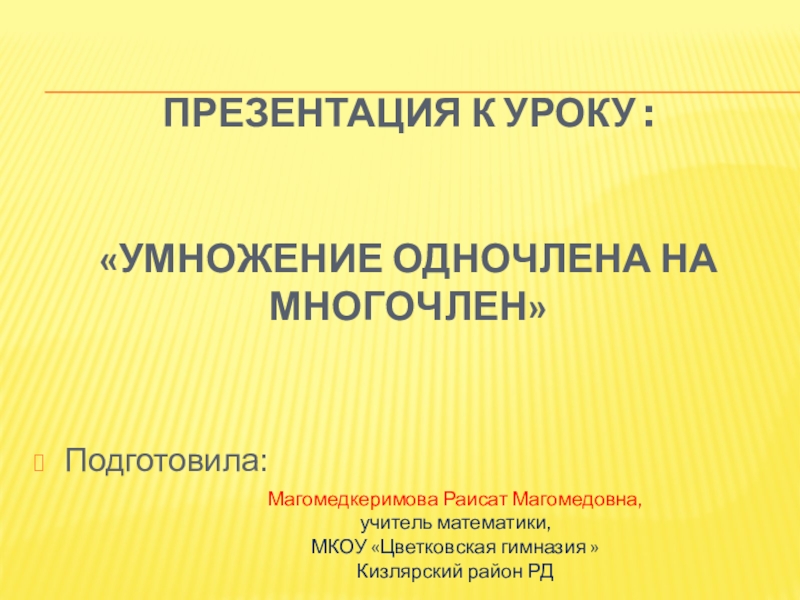 Презентация к уроку :   «Умножение одночлена на многочлен»Подготовила:Магомедкеримова Раисат Магомедовна, учитель математики,  МКОУ «Цветковская