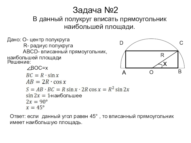 Ответ: если данный угол равен 45° , то вписанный прямоугольник имеет наибольшую площадь.