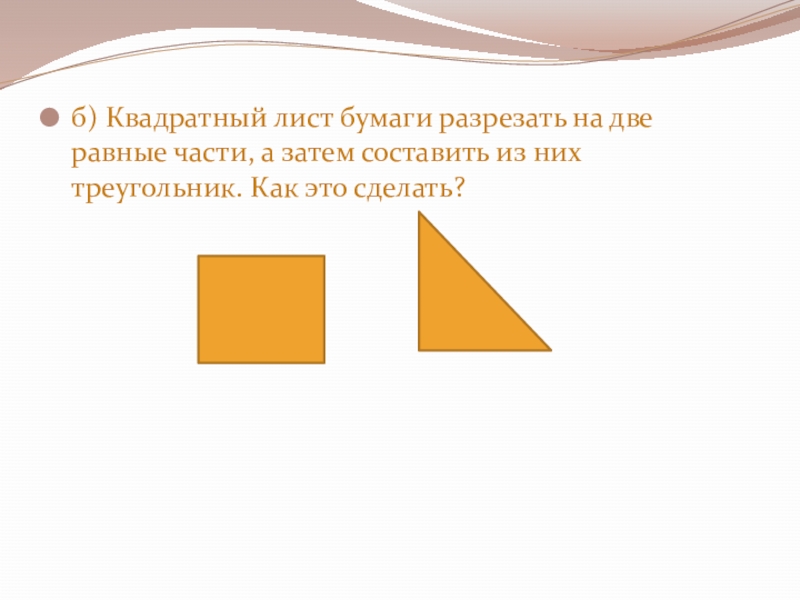 б) Квадратный лист бумаги разрезать на две равные части, а затем