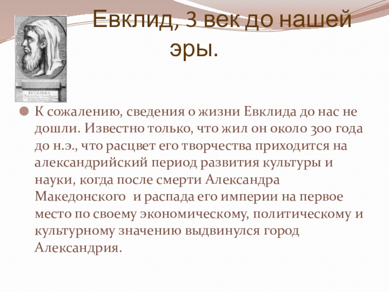 сожалению, сведения о жизни Евклида до нас не дошли. Известно только, что жил он около 300 года до н.э., что расцвет его творчества приходится на александрийский период развития культуры и науки, когда после смерти Александра Македонского и распада его империи на первое место по своему экономическому, политическому и культурному значению выдвинулся город Александрия.