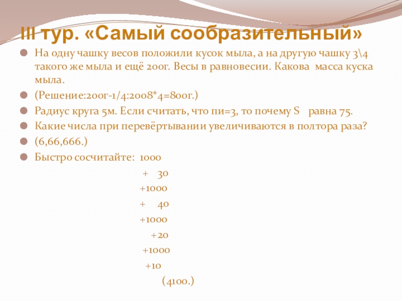на другую чашку 3\4 такого же мыла и ещё 200г. Весы в равновесии. Какова масса куска мыла.
