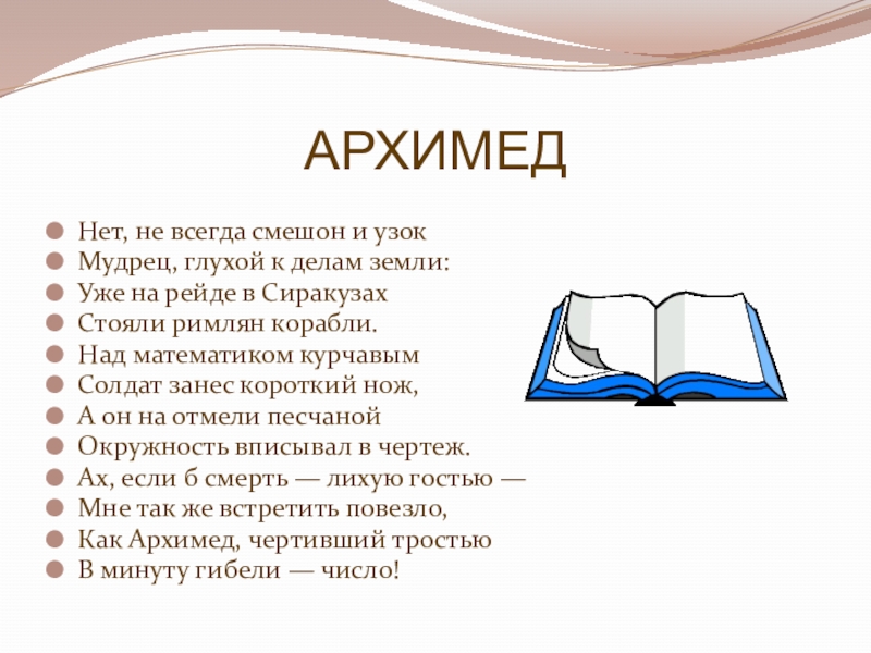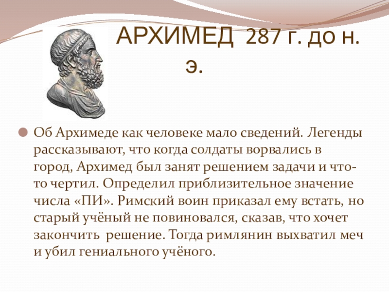Об Архимеде как человеке мало сведений. Легенды рассказывают, что когда солдаты ворвались в город, Архимед был занят решением задачи и что-то чертил. Определил приблизительное значение числа «ПИ». Римский воин приказал ему встать, но старый учёный не повиновался, сказав, что хочет закончить решение. Тогда римлянин выхватил меч и убил гениального учёного.
