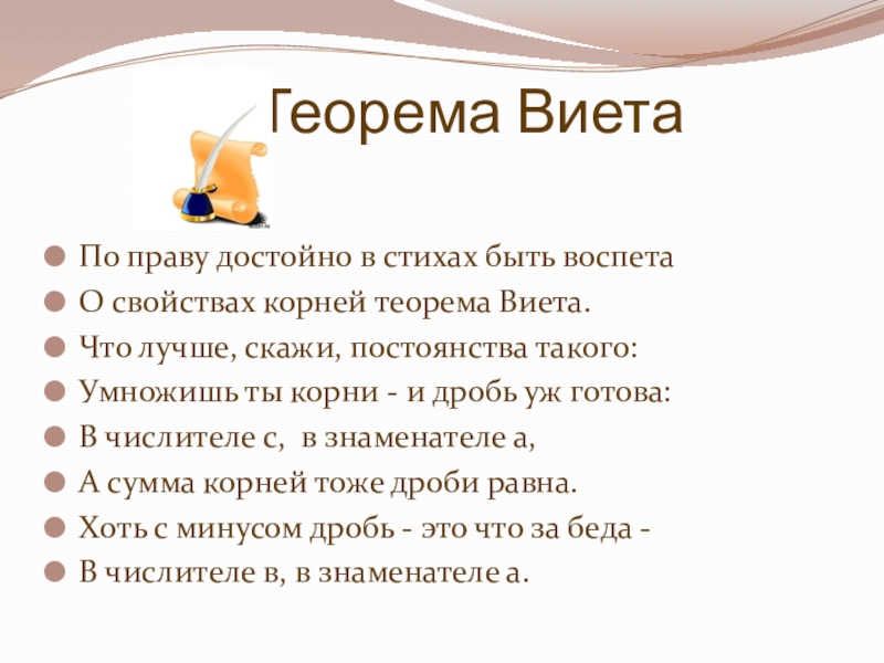 символики: в его работах имеется вывод формулы корней квадратного уравнения и их свойств, сформулирована теорема косинусов.
