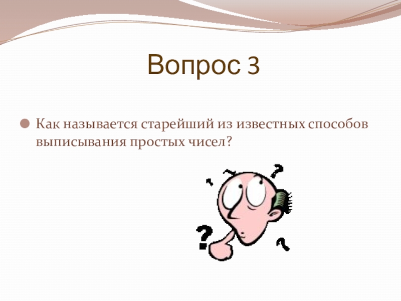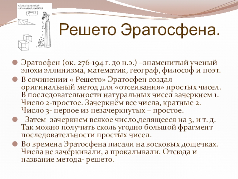 В сочинении « Решето» Эратосфен создал оригинальный метод для «отсеивания» простых чисел. В последовательности натуральных чисел зачеркнем 1. Число 2-простое. Зачеркнём все числа, кратные 2. Число 3- первое из незачеркнутых – простое.