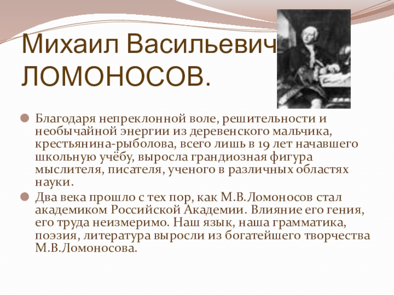 Два века прошло с тех пор, как М.В.Ломоносов стал академиком Российской Академии. Влияние его гения, его труда неизмеримо. Наш язык, наша грамматика, поэзия, литература выросли из богатейшего творчества М.В.Ломоносова.