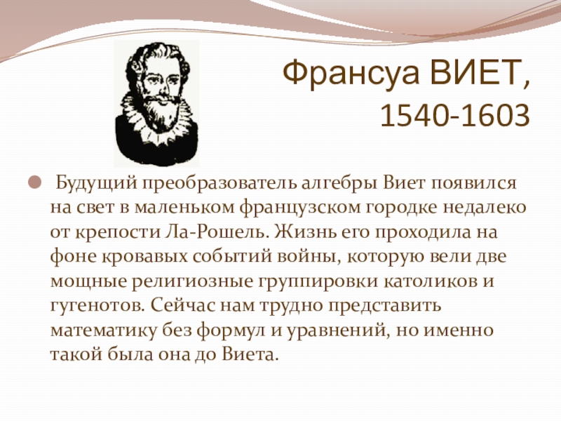 французском городке недалеко от крепости Ла-Рошель. Жизнь его проходила на фоне кровавых событий войны, которую вели две мощные религиозные группировки католиков и гугенотов. Сейчас нам трудно представить математику без формул и уравнений, но именно такой была она до Виета.